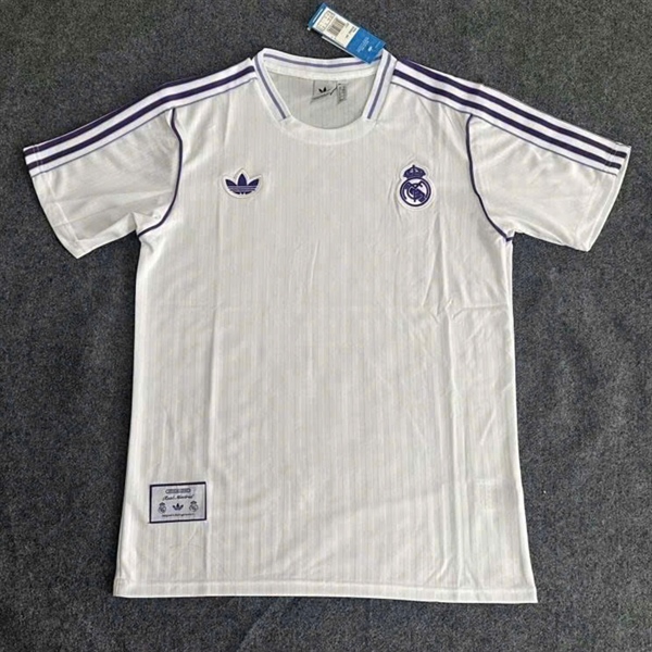 Áo bóng đá ICONS REAL TRẮNG SỌC TÍM 25/26 với chất liệu thun Thái Lan COTTON POLYESTER NEW 100%, chuẩn form Châu Âu